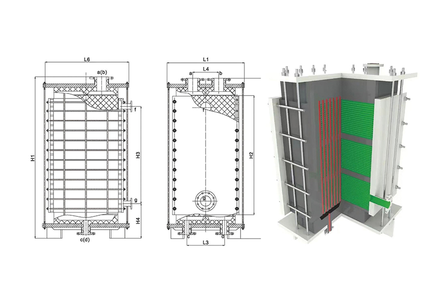 矩形石墨換熱器:由若干數(shù)量的矩形石墨換熱塊、上下石墨封頭及其金屬蓋板和兩側金屬側蓋等主要零件組成,各零件之間用成型防腐墊片密封,上下金屬蓋板和兩側蓋板,用長拉桿螺栓連接將石墨塊緊固為一體。矩形塊孔式石墨熱換器按照石墨塊體上兩種介質孔道的相對位置,可分為垂直交錯式和平行交錯式兩種,垂直式的結構簡單,密封,可用于較高操作壓力,是目前應用較廣泛的石墨熱換器形式。矩形塊孔式石墨換熱器的石墨材料體積利用率高,結構緊湊,節(jié)省材料,設備成本較低,可進行逆流操作和多流程操作,從而獲得更高的傳熱效率。還可以用于兩種腐蝕性介質的雙效換熱交換。