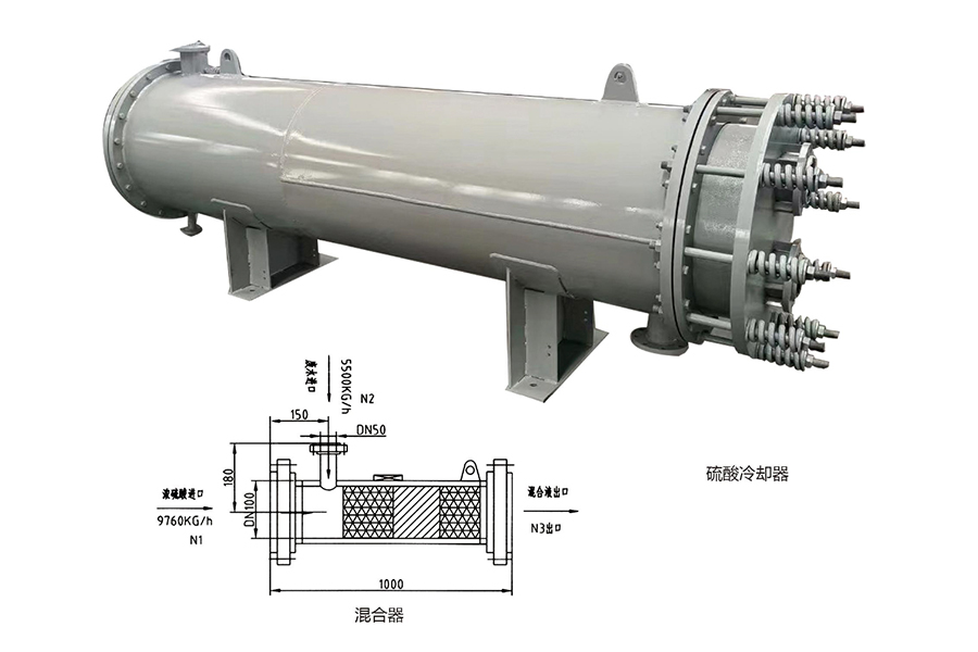 硫酸稀釋冷卻器結(jié)構(gòu):由混合器和冷卻器兩部分組成,混合器用于濃硫酸與軟水混合、稀釋、分配。冷卻器是將均勻混合后的高溫稀酸冷卻至所需溫度,本型為濃硫酸稀釋工藝中最為先進(jìn)的設(shè)備,可將98酸一次稀釋到任意濃度,并且稀釋后直接進(jìn)行冷卻至50℃以下,該裝置可以根據(jù)客戶需求進(jìn)行全自動(dòng)控制設(shè)計(jì)或模塊單元裝置交付。